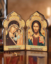 Christ and Our Lady of Kazan Diptych - set of 4 | This attractive and affordable hinged diptych will make a lovely addition to your desk, library shelves, or to accompany you in your travels. Featuring classic icons of Our Lady of Kazan and Christ the Teacher, set in a colorfulornamental border. Wooden icon with embossed gold-foil ornamentation. 3 ... |