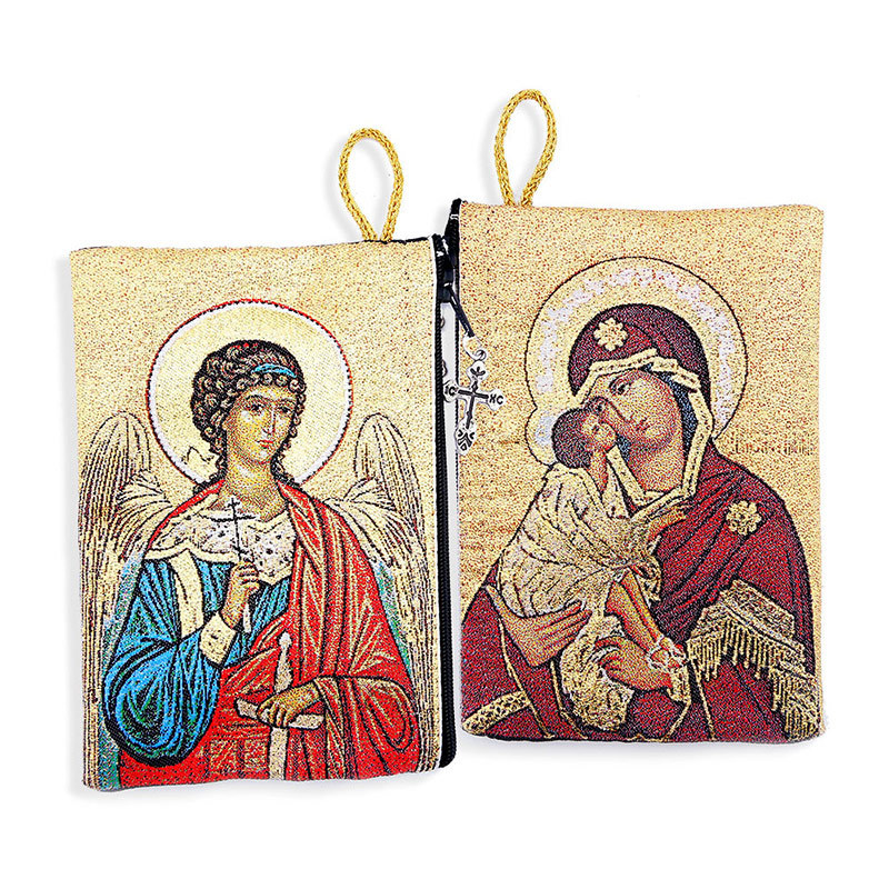 An attractive and affordable choice for gift presentations to friends, students, and parish members!This Two Sided Rosary Pouch features on one side a icon of Saint Michael the Archangel holding his sword, and a classic Orthodox style icon of the Madonna and Child on the other side. This is a beautiful way to store your most precious rosary or other religious jewelry. Woven with shimmering strands of gold, this lined and zippered tapestry pouch. 4" x 5 1/2". Set of 6, rosary not included. For other gifts for the faithful including beautiful Rosary Pouches, shop Monastery Icons.