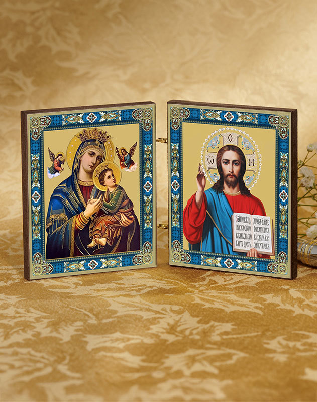 This attractive and affordable hinged diptych will make a lovely addition to your desk, library shelves, or to accompany you in your travels. Featuring classic icons of Our Lady of Perpetual Help and Christ the Teacher, set in a colorful blue ornamental border. Wooden icon with embossed gold-foil ornamentation. 3 in x 5 1/4 in (when open). Set of 4 diptychs.