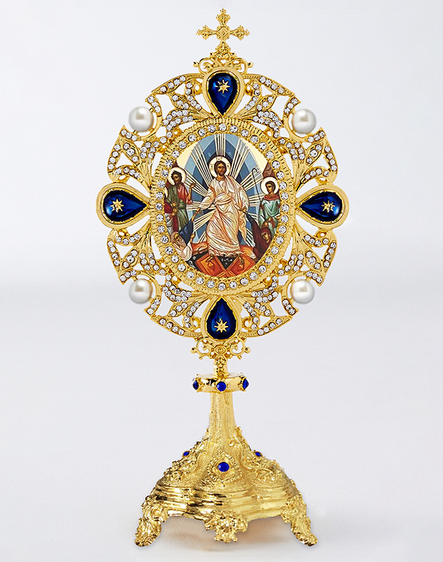 Awe-inspiring in its detail, breathtaking in its beauty, the Heirloom Monstrance Style Risen Christ Ornament features an Icon of Christ Risen, centered in a self-standing ornament. Featuring a splendid blend of faux jewels, pearls and other ornamentation, this stunning item makes a lasting impression.