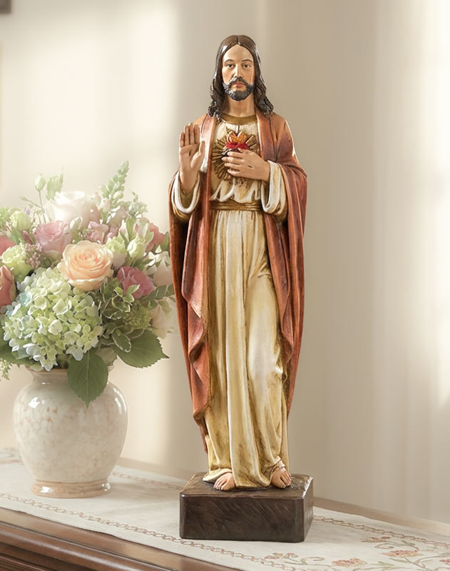 This hand painted classic figurine of the Sacred heart of Jesus will bring inspiration to wherever you display it: an alcove, a greeting spot for visitors, or as the central figurine in your home shrine or in a chapel. Approximately 22.5" tall, resin.