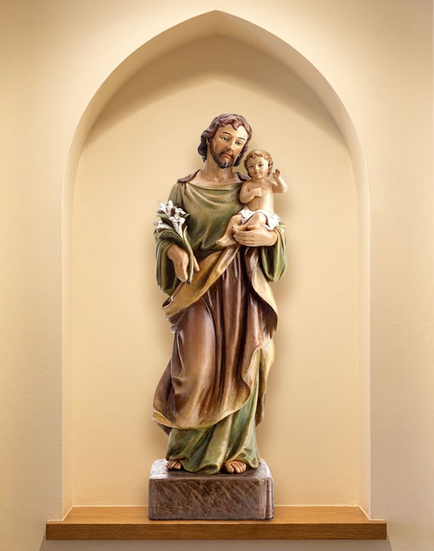 This hand painted classic figurine of Saint Joseph and the Divine Child will bring inspiration to wherever you display it: an alcove, a greeting spot for visitors, or as the central figurine in your home shrine or in a chapel. Approximately 22" tall, resin.
