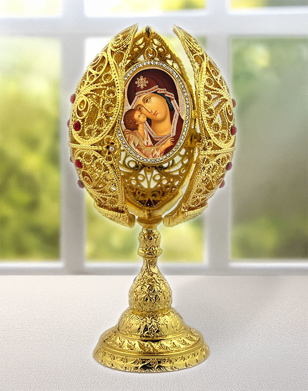 A memorable and exquisite gift, this Faberge style metal egg with delicate filigree features a colorful icon set in a 1 3/8Ó x 2Ó frame. Decorated with red and clear glass crystals, beautifully gift boxed, the egg measures 2 _Ó x 6Ó and its hinged doors open up (5Ó wide).