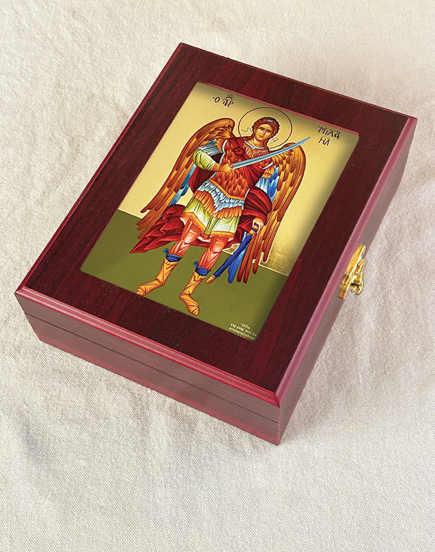 An attractive and worthy place to store your sacred and special items in this new cherrywood box. Features a detailed print of the Byzantine style icon the Archangel Michael made in Greece. Brass hinges and clasp. Keyholed on the back for wall-hanging. 6 x 7 1/2 x 2 1/2 inches. Shipping $9.95.