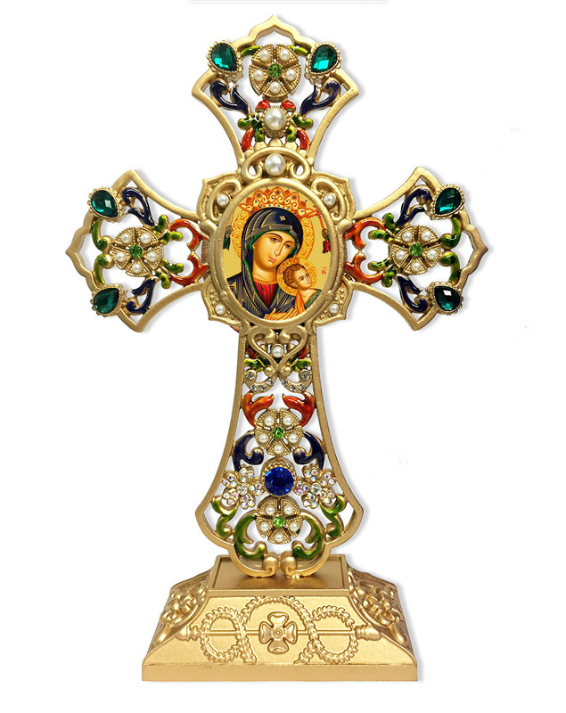 A memorable and unique gift for any occasion and an inspiring addition to your home. This elegant Standing Cross features a colorful traditional icon of Our Lady of Perpetual Help at the center of a gold-colored metal cross with elegant filigree design. Adorned with faux pearls and glass jewels on both sides of the cross.