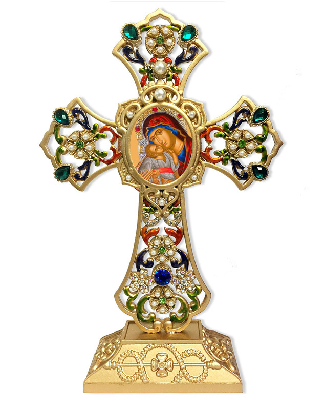 A memorable and unique gift for any occasion and an inspiring addition to your home. This elegant Standing Cross features a colorful traditional icon of the Sweet Kissing Madonna and Child at the center of a gold-colored metal cross with elegant filigree design. Adorned with faux pearls and glass jewels on both sides of the cross.