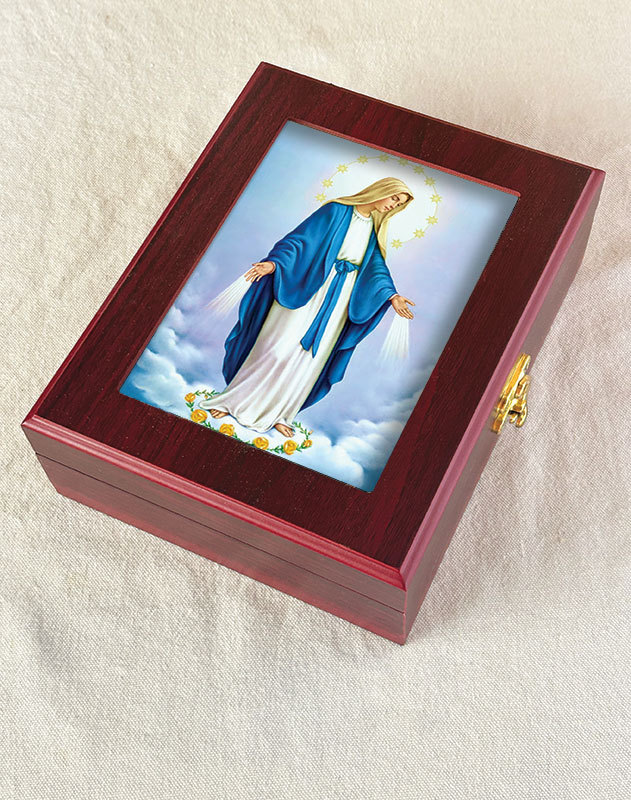 An attractive and worthy place to store your sacred and special items in this new cherrywood box. Features a colorful detailed print of Our Lady of Grace. Brass hinges and clasp. Keyholed on the back for wall-hanging. 6 x 7 1/2 x 2 1/2 inches. Shipping $9.95.