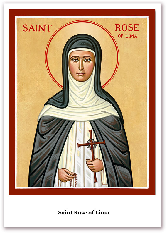 These St. Rose of Lima Holy Cards depict the patroness saint of Latin America and the Philippines. These holy cards featuring saint icons are printed on the finest glossy card stock available (3 1/2" x 5"). $20.00 per 100 cards, minimum order 500 cards (five times the base package of 100 cards). For even more Holy Cards, browse the collection at Monastery Icons.